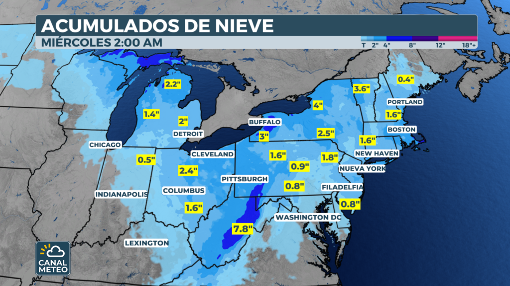 La nieve noreste EE.UU. cae sobre una zona con cifras excepcionales. Las áreas a sotavento de los Grandes Lagos registran entre el 110 % y el 200 % de su media estacional. Así pues, cada nuevo episodio añade presión sobre la infraestructura.