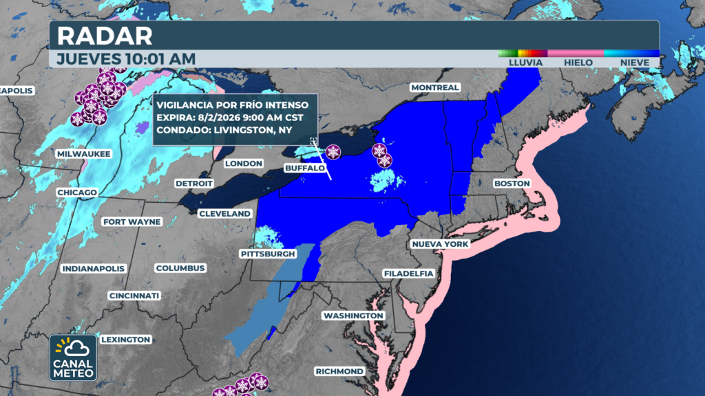 Fuertes vientos del noroeste canalizarán aire del vórtice polar. Boston, Nueva York y Filadelfia sufrirán las condiciones más duras. El Servicio Meteorológico Nacional podría emitir avisos de frío extremo, algo muy poco frecuente en esta región.