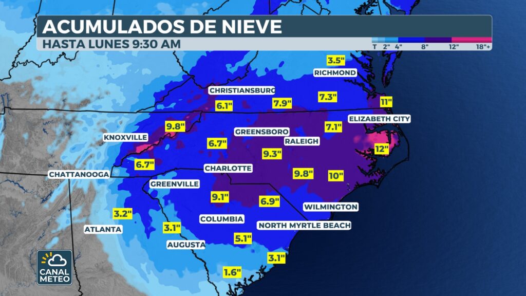 El sábado por la mañana la situación cambiará rápidamente. La baja costera comenzará a desarrollarse. La nieve se extenderá por las zonas altas de varios estados. Las ciudades más afectadas serán Richmond, Raleigh, Charlotte y Columbia. Las tasas de acumulación podrían ser muy altas. Se esperan muy pocos descansos durante todo el día.