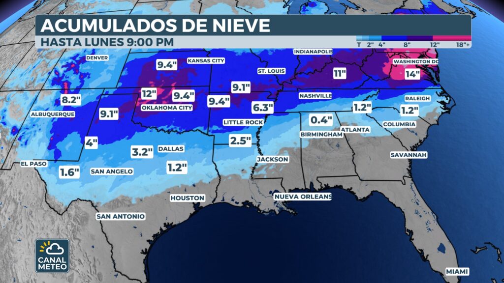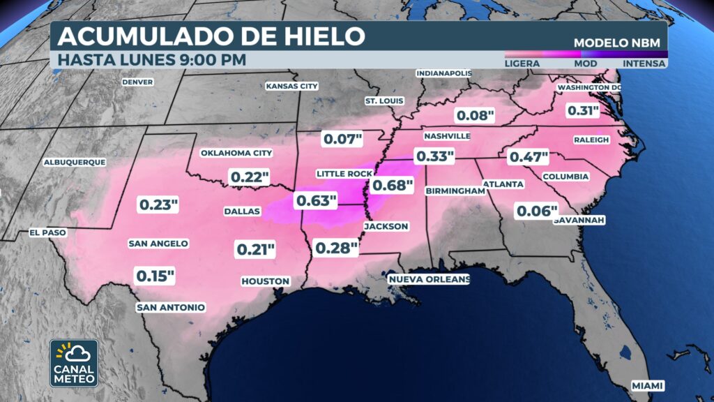 Una tormenta de hielo paralizante será la amenaza principal dentro del componente sur de este sistema colosal. Más de 15 estados se extienden a lo largo de un corredor masivo desde Nuevo México hasta las Carolinas. La acumulación de hielo podría causar numerosos cortes de energía desde el viernes hasta el lunes.