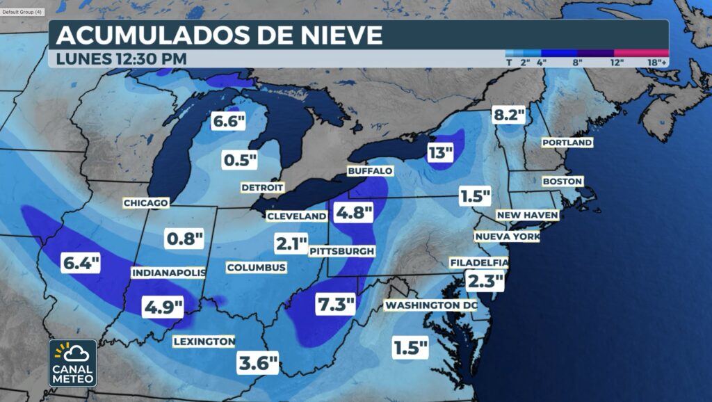 Se esperan acumulaciones generales de 1 a 3 pulgadas desde Indiana y Ohio hasta Maryland, Nueva Jersey y partes del sur de Nueva Inglaterra. En zonas de Indiana y Ohio podrían registrarse acumulaciones localmente de 3 a 5 pulgadas.