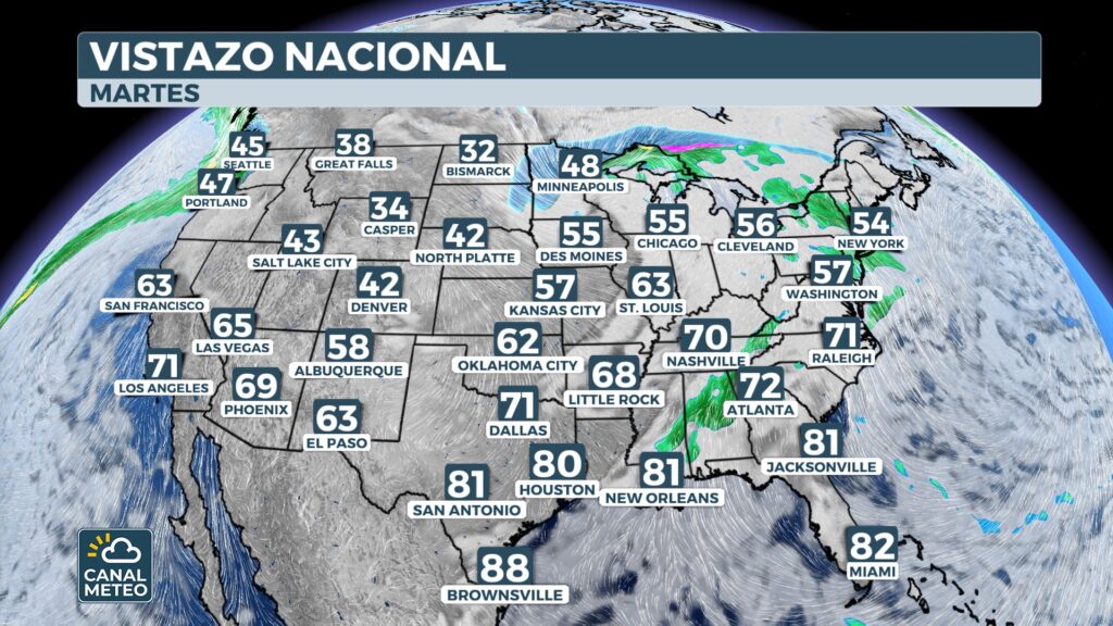 un nuevo frente frío cruzará la franja norte del país, llevando lluvia al noreste y nieve a partes de Minnesota, Dakotas y Wyoming.