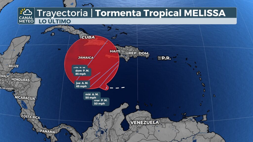 Según el NHC, Melissa presenta vientos máximos sostenidos de 50 mph (80 km/h) y se ubica aproximadamente a 300 millas (480 km) al sur de Puerto Príncipe, Haití, desplazándose hacia el oeste a unos 13 mph (21 km/h). Se prevé una disminución de su velocidad y un giro gradual hacia el noroeste y norte durante los próximos días.