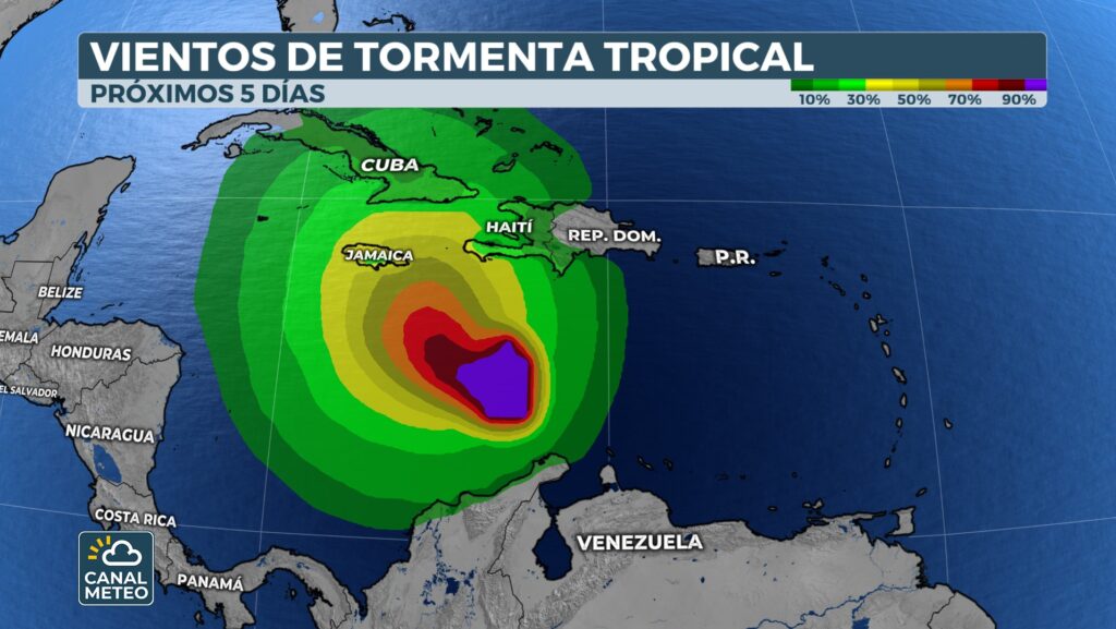 Con esta trayectoria, la tormenta tropical Melissa se acercaría al suroeste de Haití y a Jamaica hacia finales de esta semana. Por ello, se emitió una vigilancia de huracán para partes de Haití, incluido Puerto Príncipe, y una vigilancia de tormenta tropical para Jamaica.